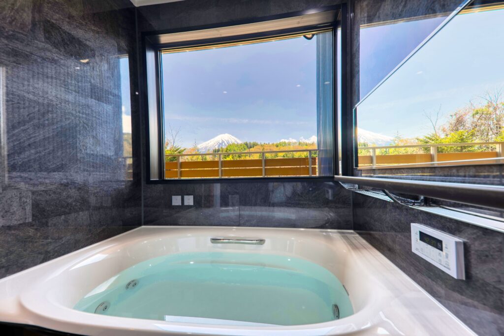 The bathroom with a jacuzzi, where Mount Fuji peeks in when you open the blinds, has received high praise from many guests.