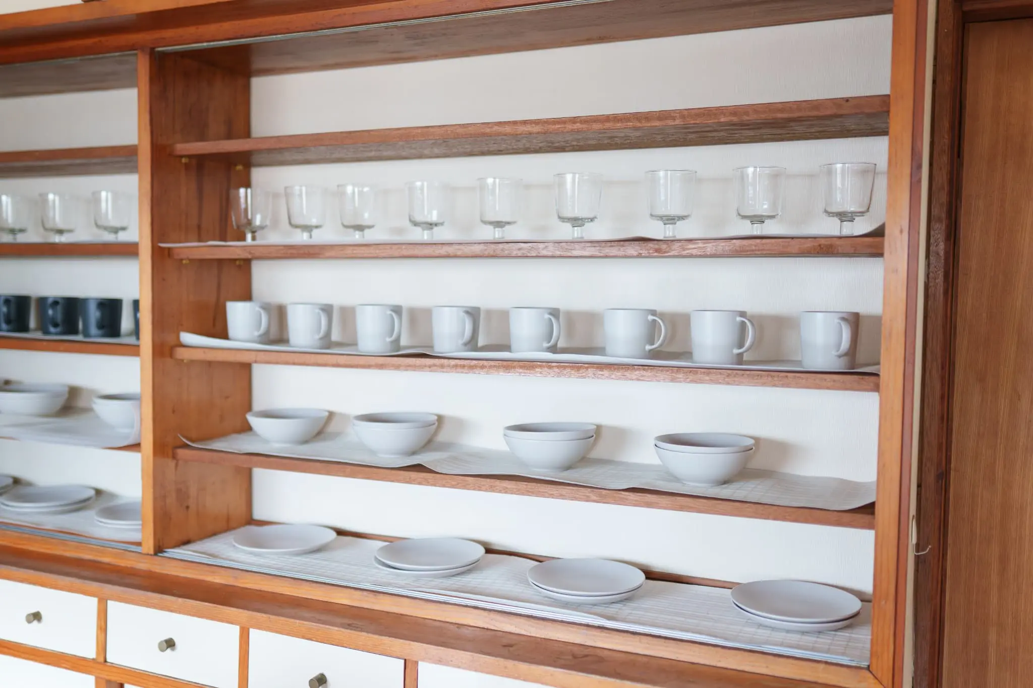 The cozy kitchen area is equipped with essential cooking utensils, tableware, and appliances for your convenience.