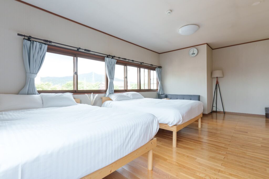 On the first floor, there is a Japanese-modern bedroom with a TV, and on the second floor, a spacious modern room featuring two double beds.