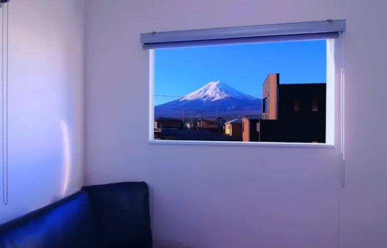 Located directly facing Mt. Fuji, this room offers a view through its small window. Designed for 2 adults, it features genuine leather beds and sofa by the luxury brand Serta. Equipped with a mini kitchen, private bathroom, and in-room projector theater.