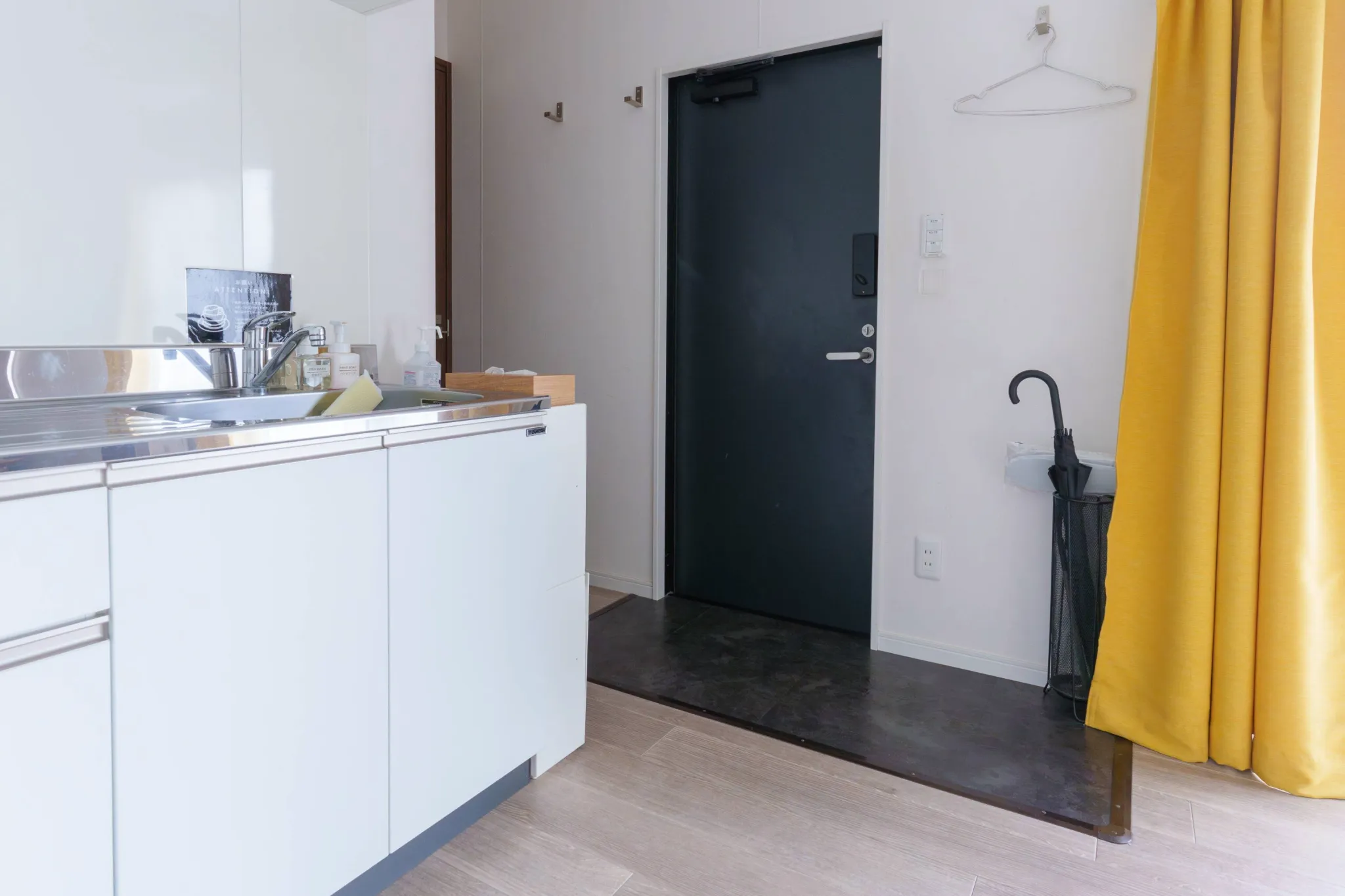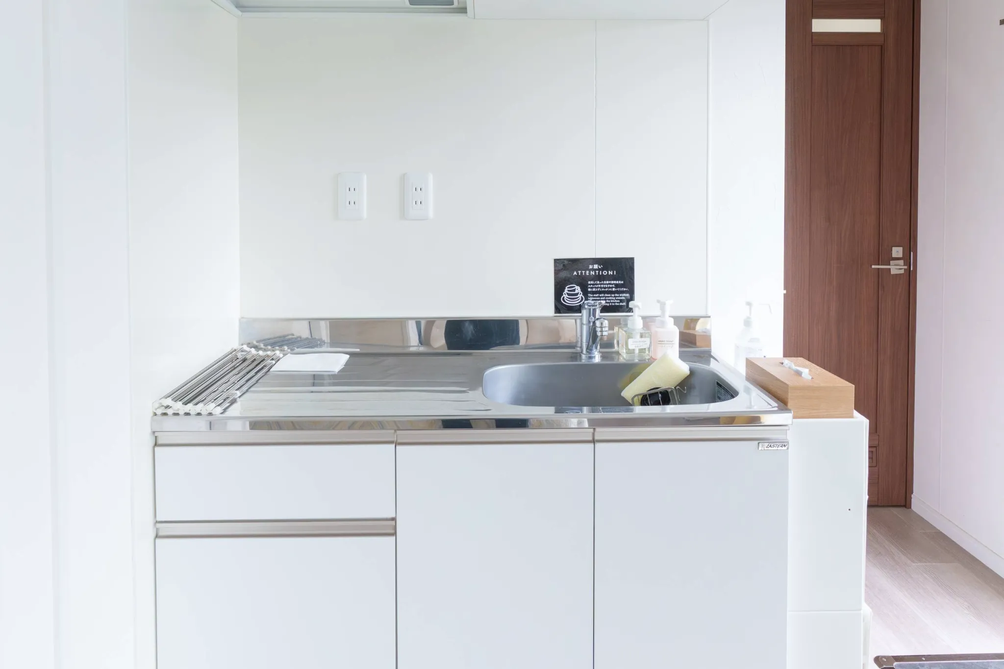 Interior with a clean, white-based design. Equipped with a king-size bed, sofa, mini kitchen, and projector theater. No view of Mount Fuji.