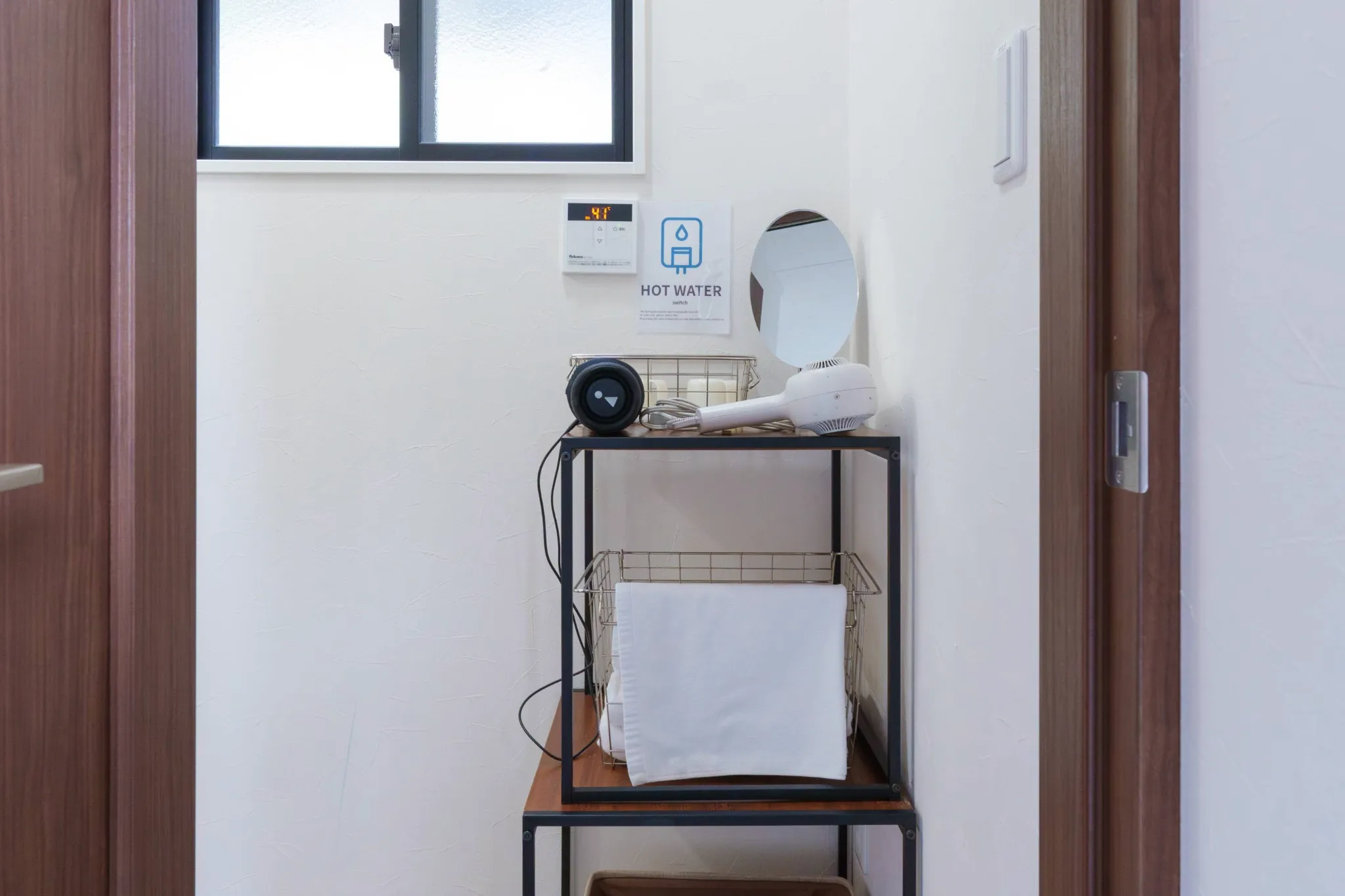 Shower, toilet, towels, bath towels, toothbrushes, and shampoo amenities included.