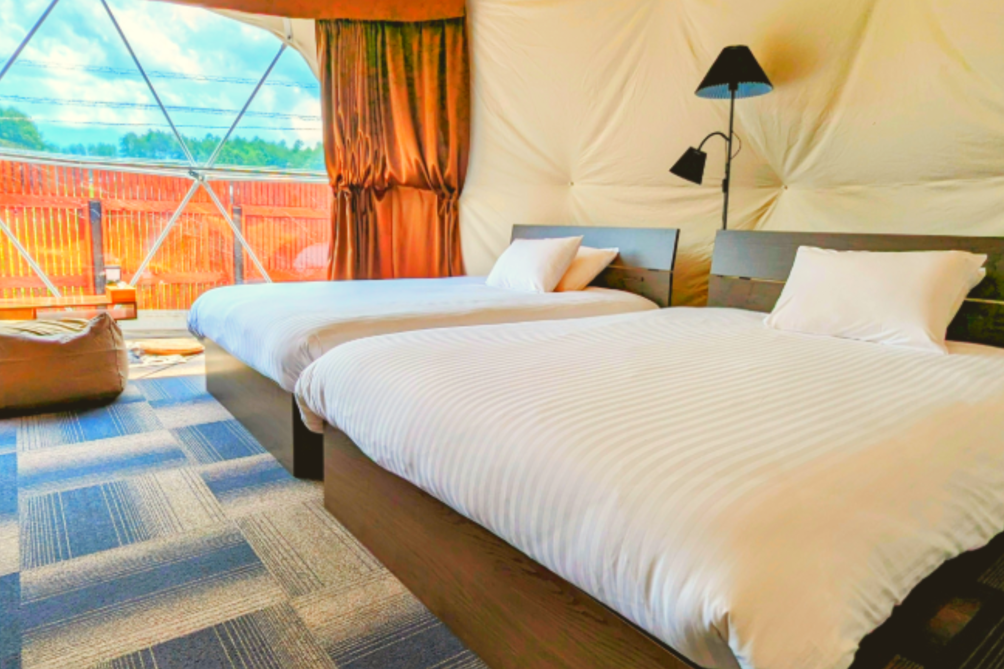 A colorful room decoration option on the bed is very popular at Suite Glamping Kawaguchiko!