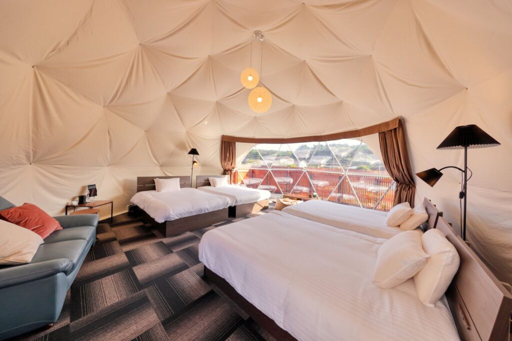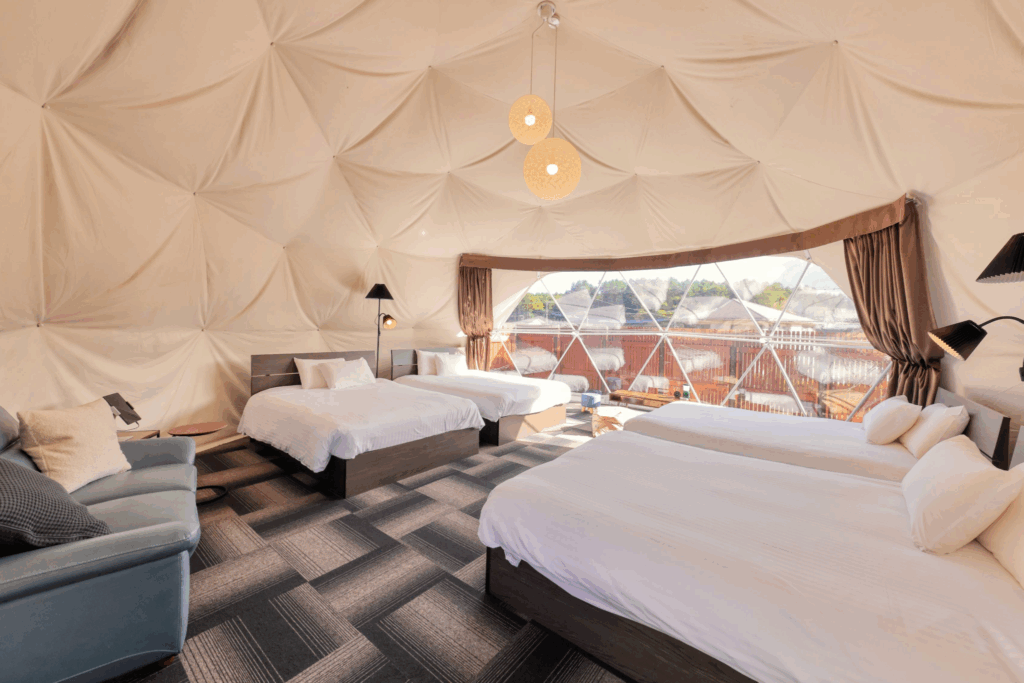 The 7-meter diameter dome tent is equipped with four double beds, a genuine leather sofa, a small table, and relaxation cushions.