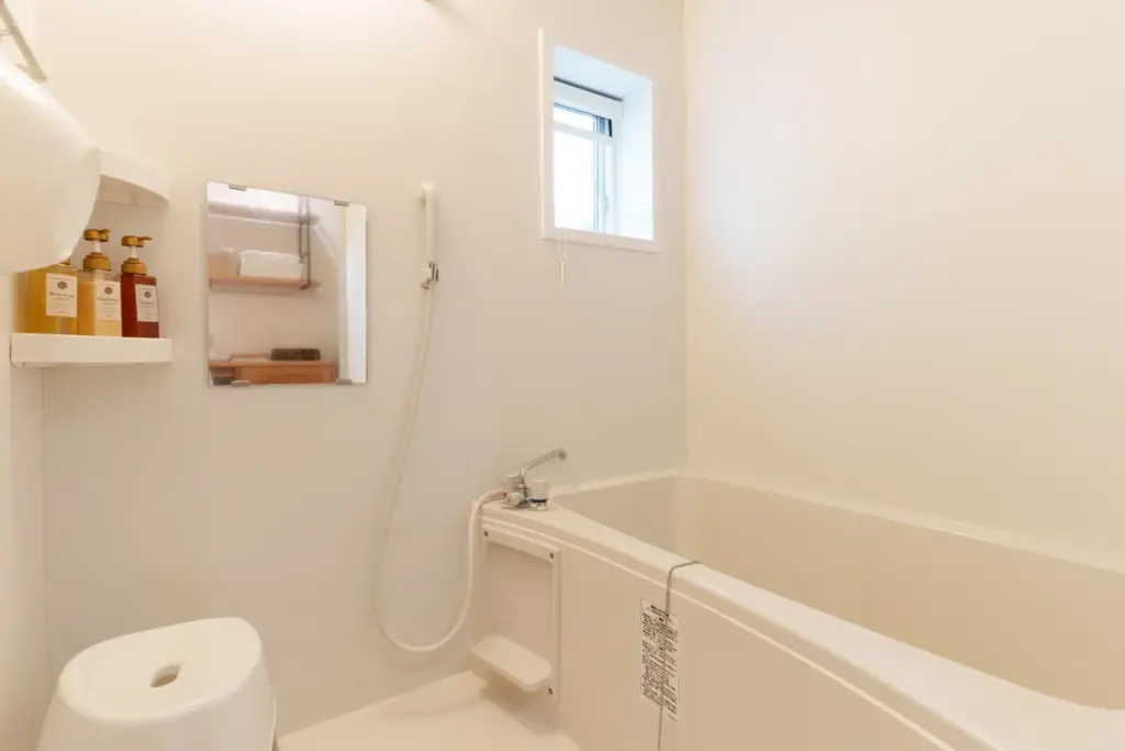 1階にはトイレ、バスルーム、洗濯機がございます。長期ステイでも安心なアメニティ類も提供しております。