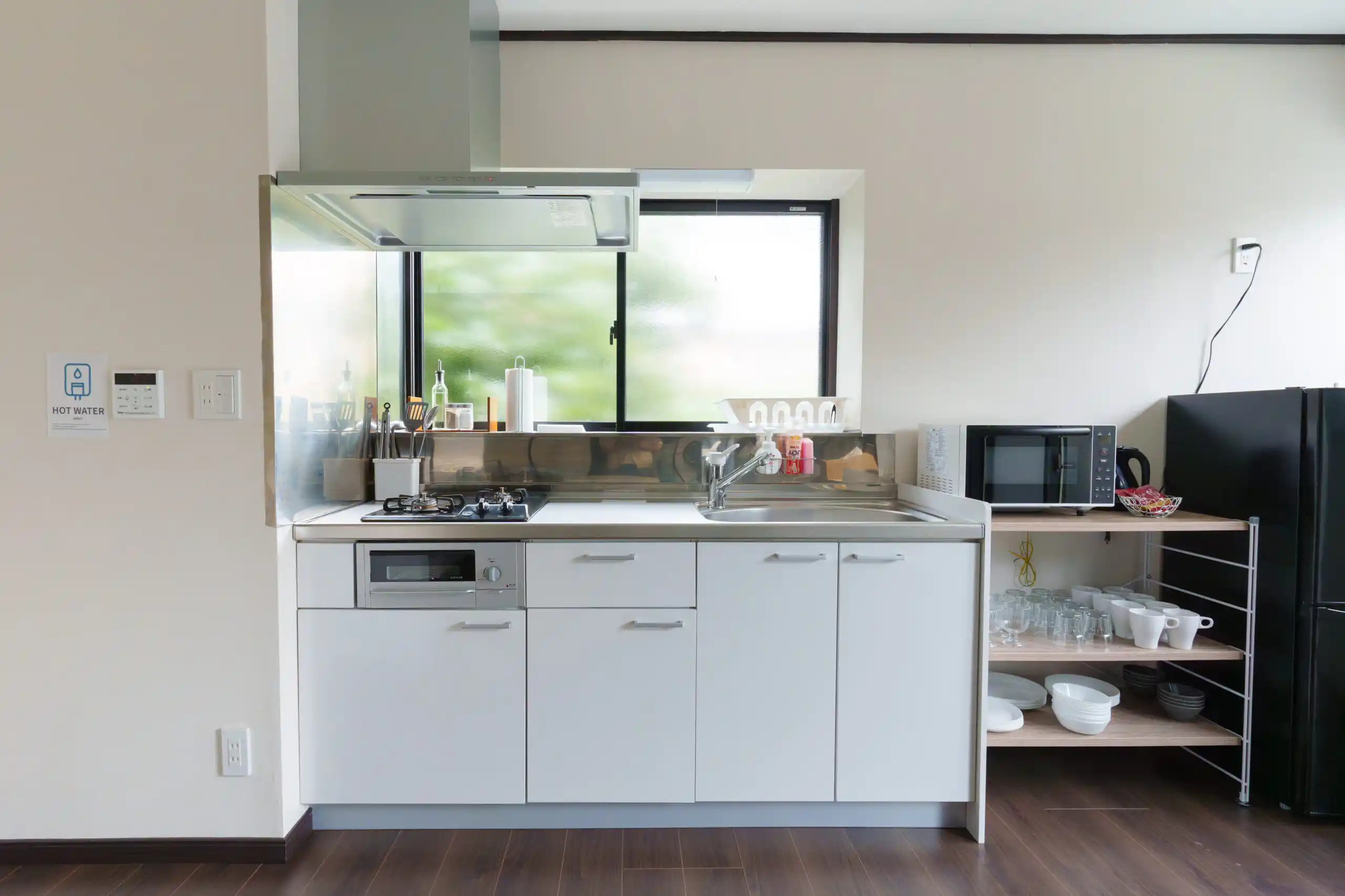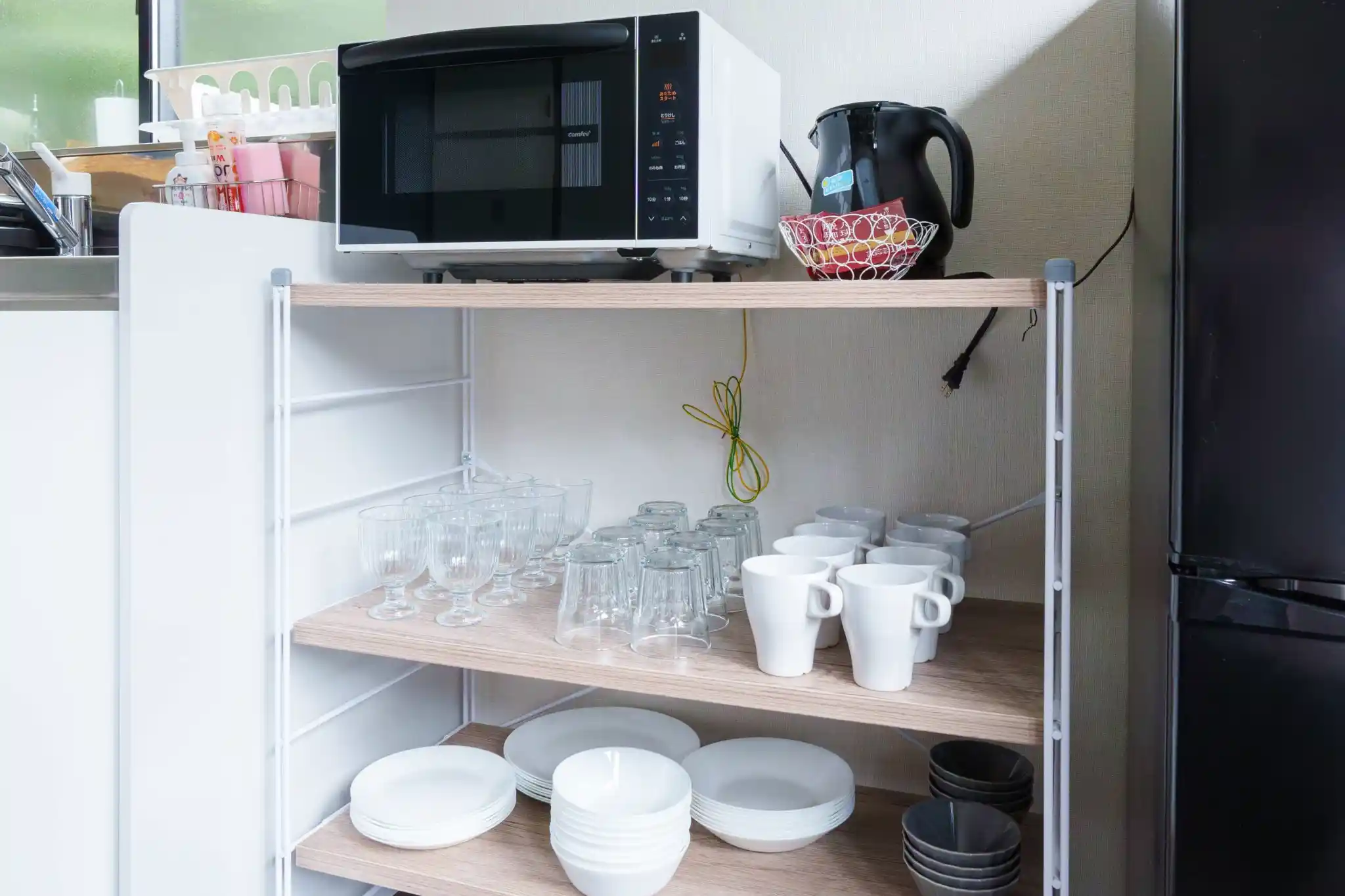 | キッチン用品 | 冷蔵庫、冷凍庫、食洗器、電子レンジ、炊飯器、包丁、まな板、電子ケトル、食器類、カトラリー類、鍋、フライパン、調理器具、トング、食器洗剤、食器スポンジ、調味料(塩コショウ、サラダ油) |