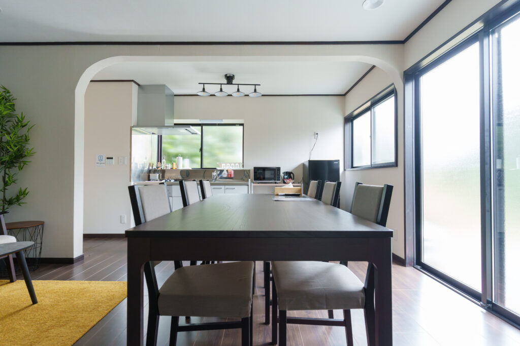 キッチン付きのダイニングルーム。6名様掛けのダイニングテーブルとソファ、TV(ケーブルレス、動画サイトのみ対応)、調理家電用品とあります。