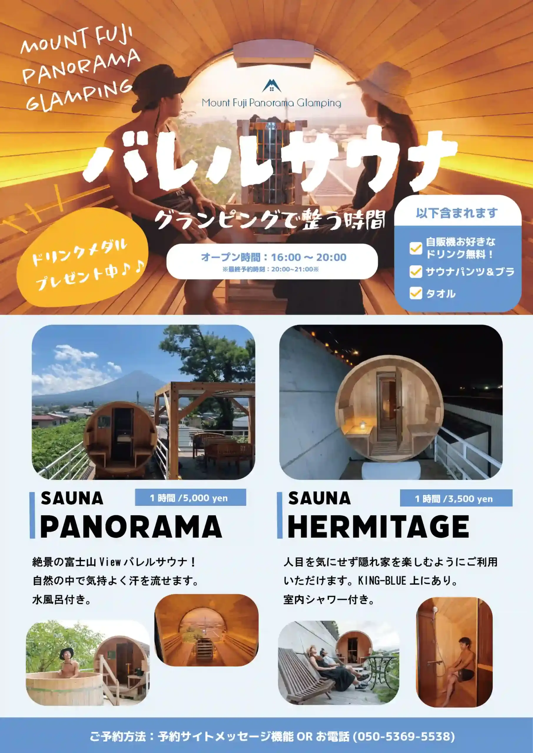 富士山ヴューのSAUNA PANORAMAと、シャワー付きSAUNA HERMITAGEの二種類のサウナをお楽しみいただけます。貸し切り利用、サウナプランもございます。