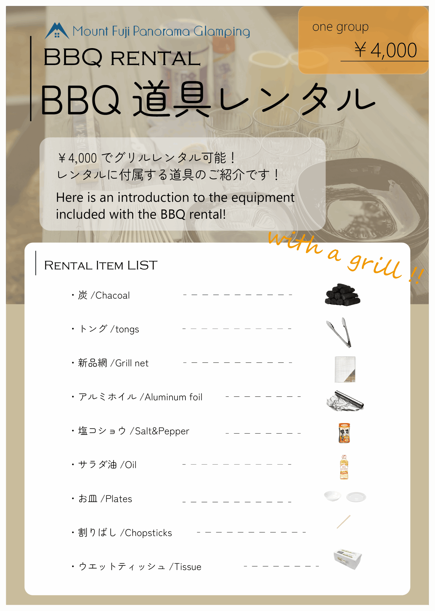コンロ、炭、炭起こしサービス、道具類が込みとなります。