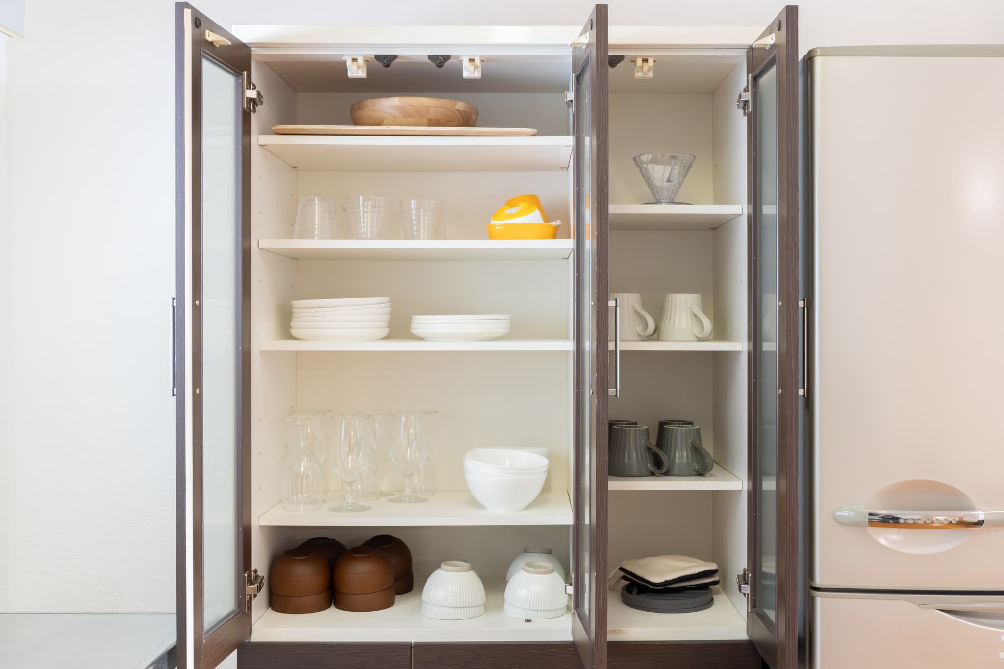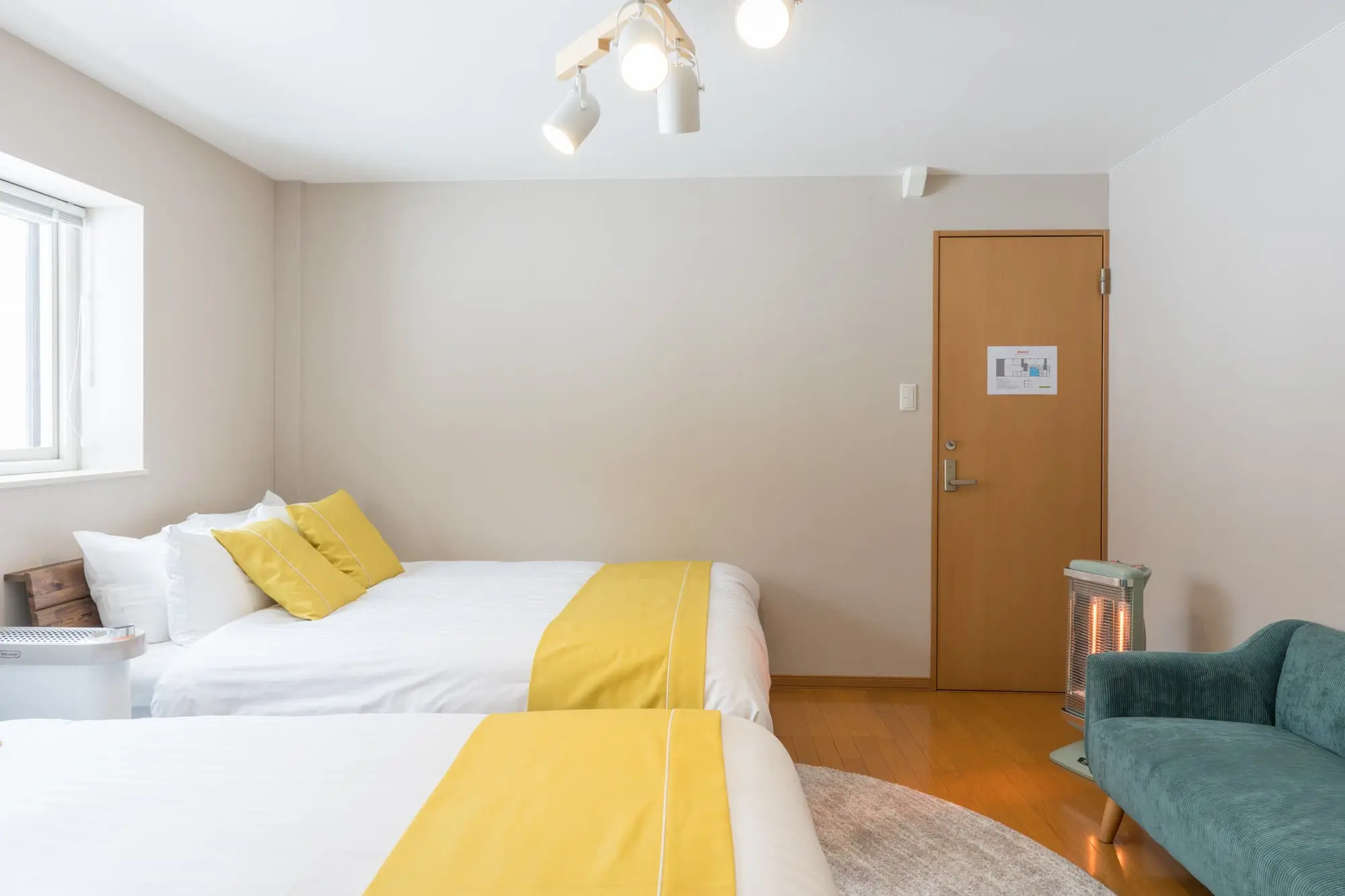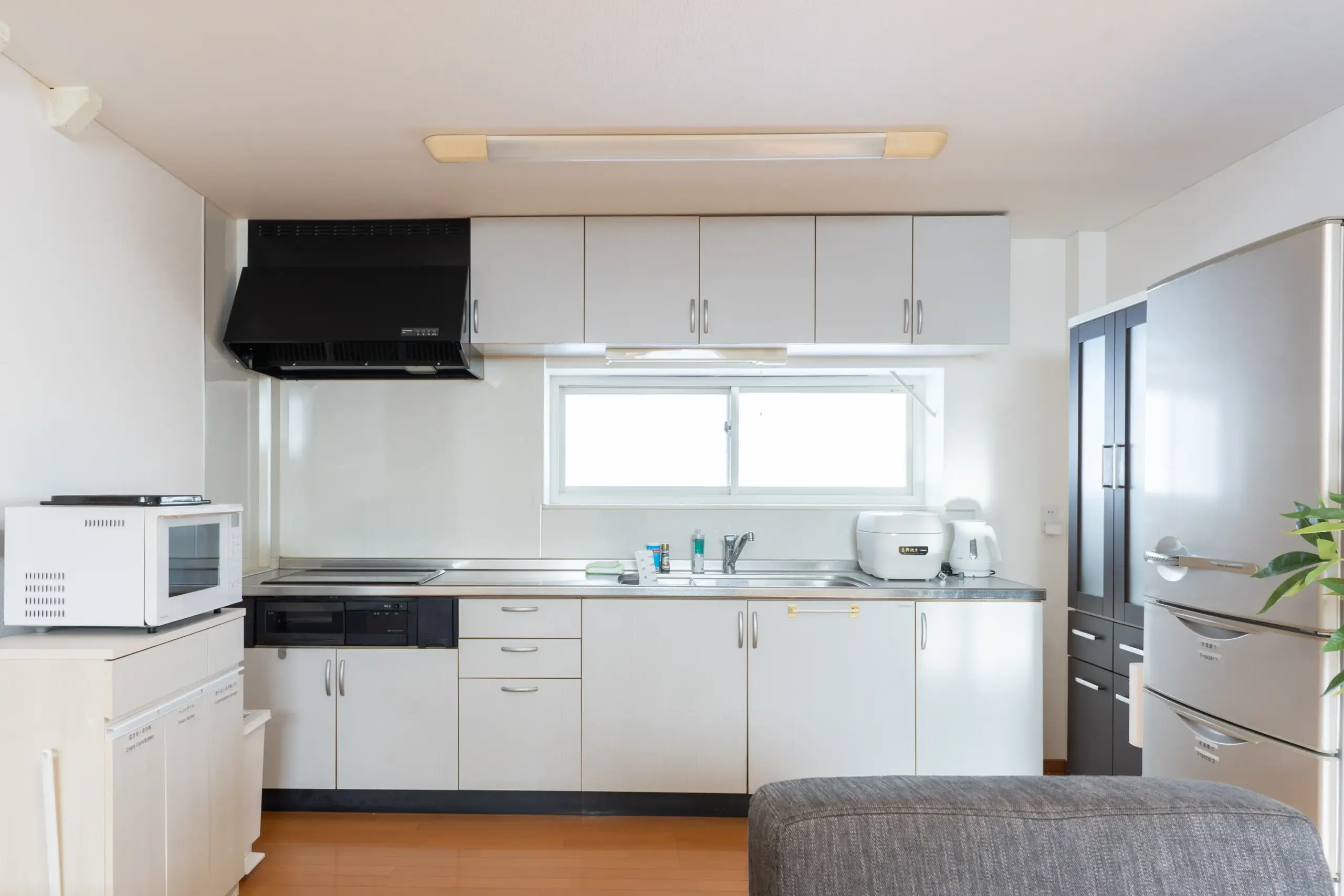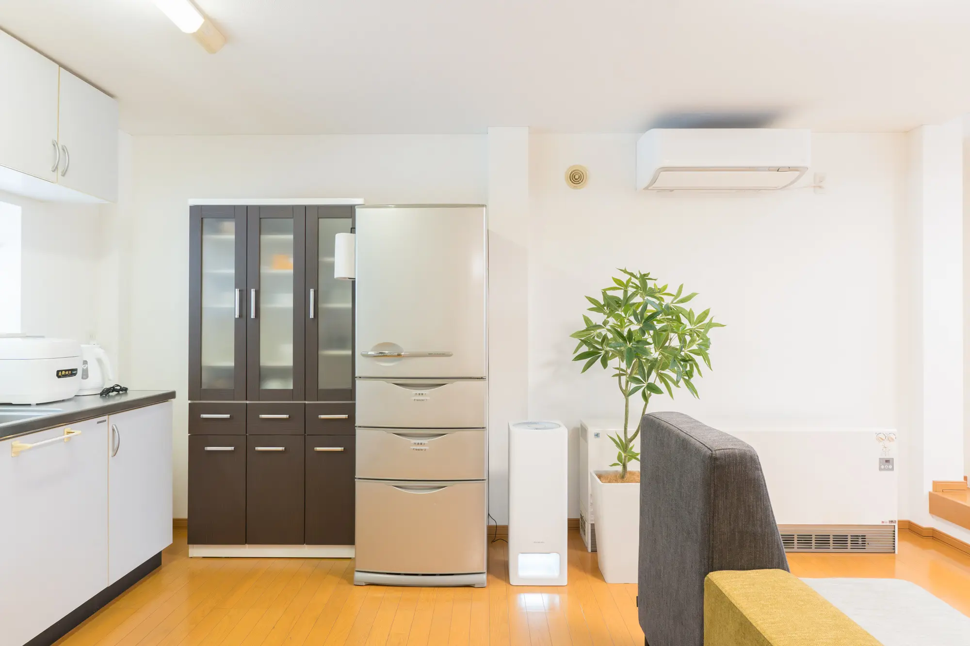 4つのベッドルームと広々としたリビングルーム、そして冷蔵庫・電子ケトルなどを備えたキッチンを完備。