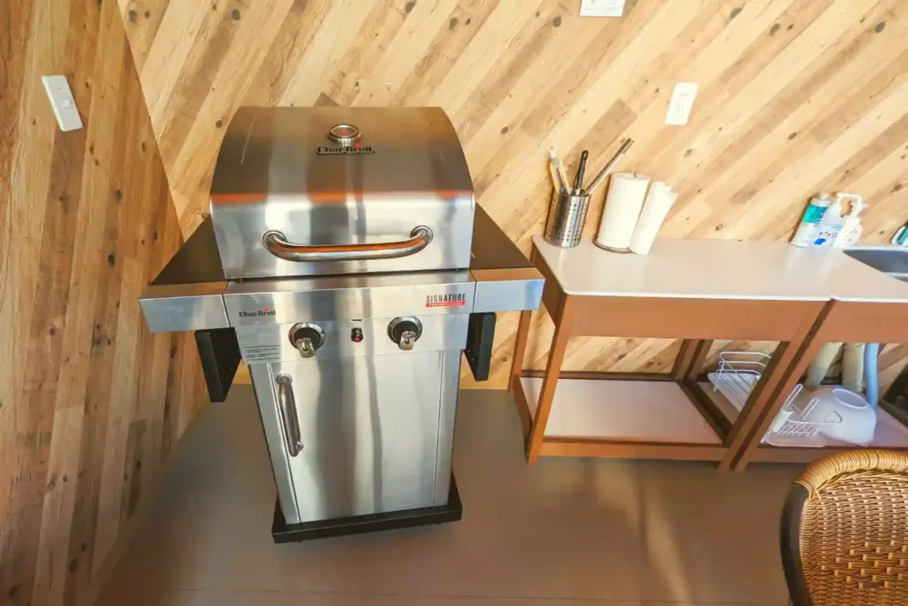 BBQ網付き。調理道具、トング、食器類、調味料はキッチンからご利用いただけます。調味料:ピンクソルト、ブラックペッパー、サラダ油。